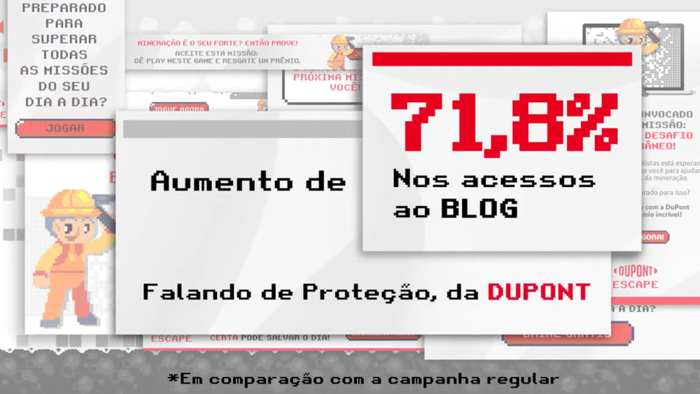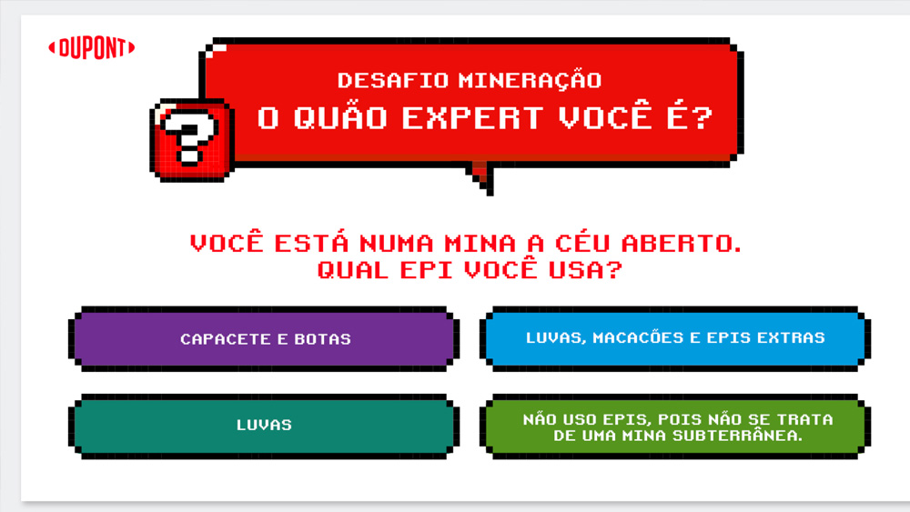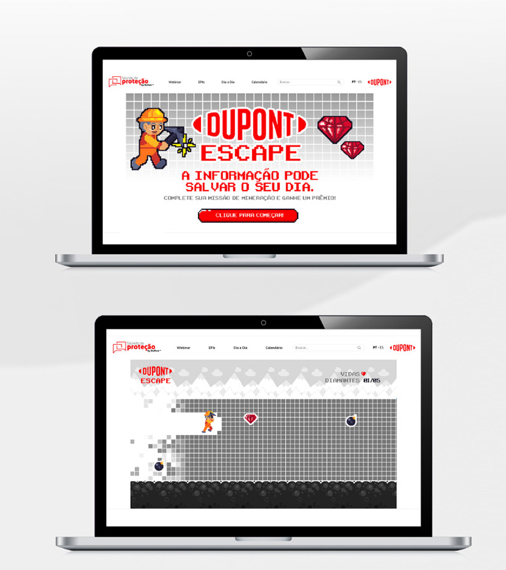 Pessoas se engajam quando se sentem desafiadas, ainda mais com umarecompensa na jogada. Criamos o DuPont Escape, um game que traz a temáticada mineração com uma dinâmica simples, mas cativante:coletar diamantes e desviar dos perigos. Ao final, o acesso ao Playbook surgecomo prêmio – seja para reconhecer a boa performance do jogador ou paraajudá-lo a ficar mais protegido na mineração.