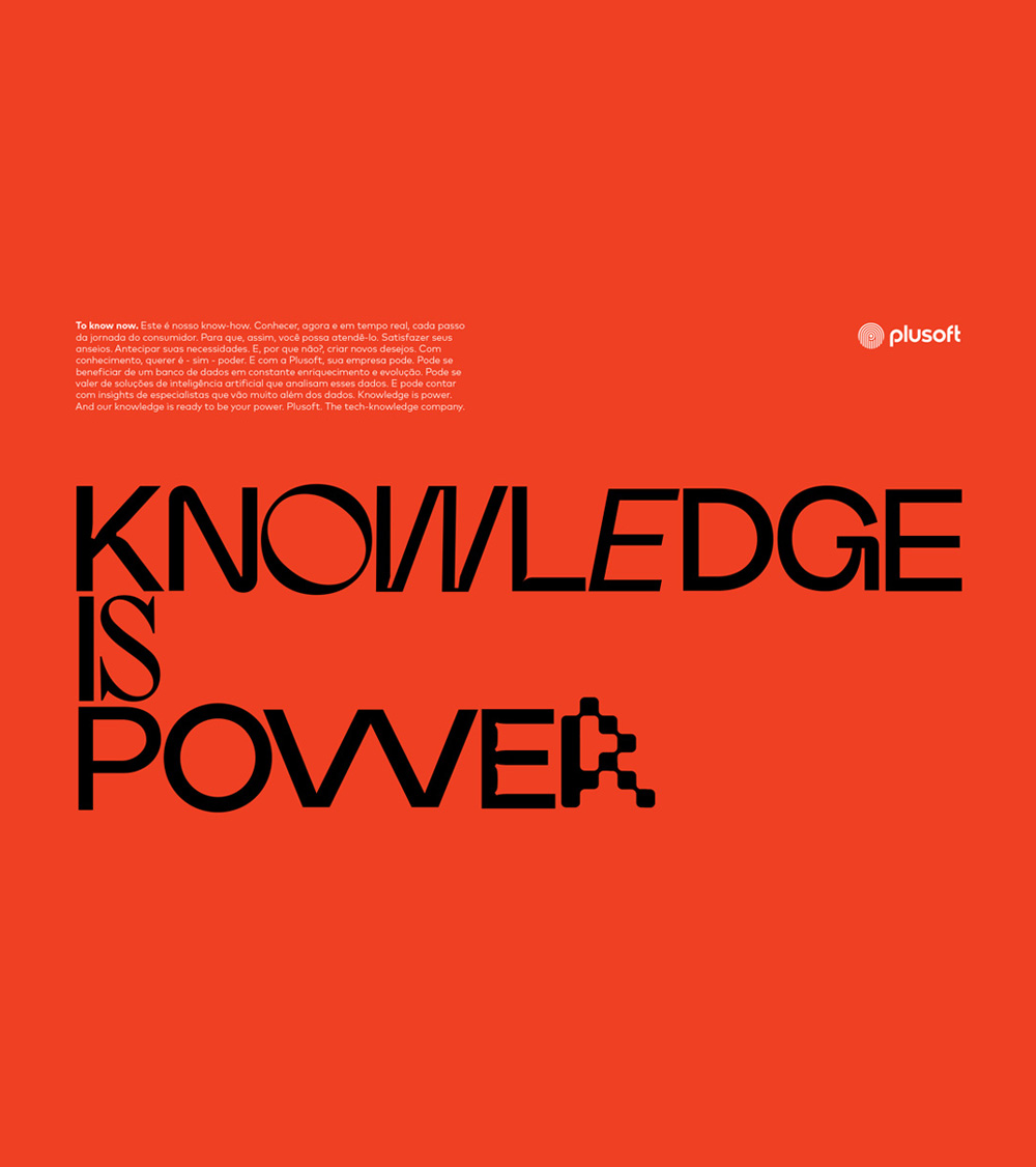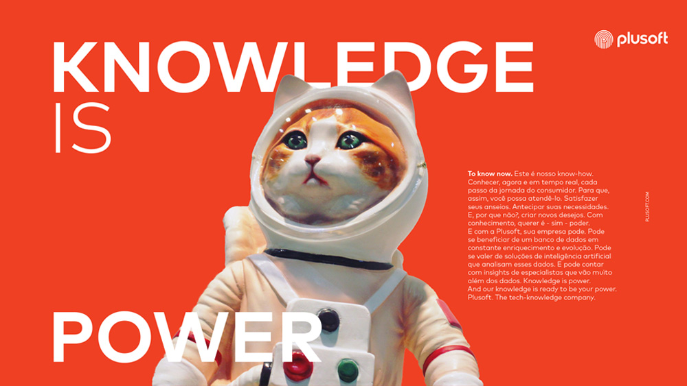 To know now. Este é nosso know-how. Conhecer, agora e em tempo real, cada passo da jornada do consumidor. Para que, assim, você possa atendê-lo. Satisfazer seus anseios. Antecipar suas necessidades. E, por que não?, criar novos desejos. Com conhecimento, querer é - sim - poder. E com a Plusoft, sua empresa pode. Pode se beneficiar de um banco de dados em constante enriquecimento e evolução. Pode se valer de soluções de inteligência artificial que analisam esses dados. E pode contar com insights de especialistas que vão muito além dos dados. Knowledge is power. And our knowledge is ready to be your power. Plusoft. The tech-knowledge company.